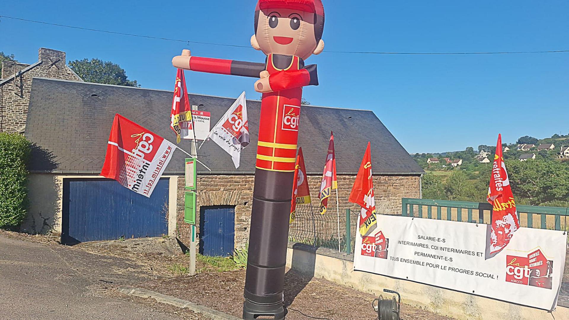 Sous un soleil éclatant, drapeaux rouges, barnum, banderoles, et même une mascotte gonflable CGT ont attiré l’attention des habitant·e·s, des médias et des spectateur·rice·s du Tour.